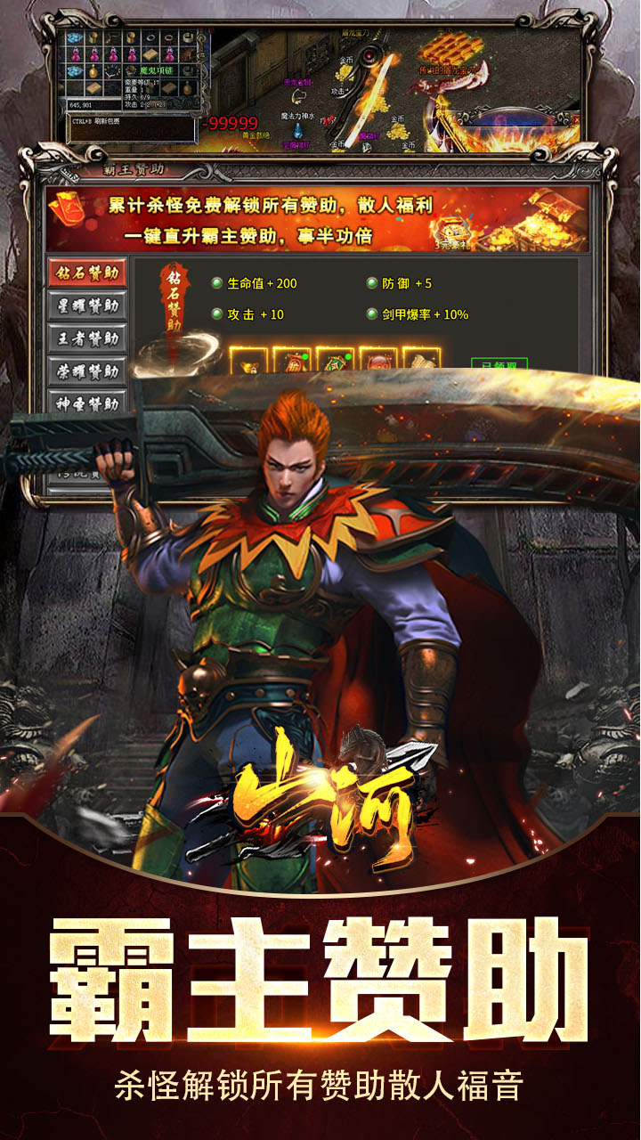 《山河》是一款全新1.85攻速专属·微变单职业传奇!登录即享豪礼:上线即送 50元真充红包:注册登录,红包秒到账,真实充值额度,助你起步无忧!专属新手套装:面具盾牌套装、勋章血石套装一键领取,前期打怪畅行无阻!版本特色:1.85攻速专属·微变单职业:保留经典手感,攻速流畅,节奏爽快,装备保值;专属神器系统:每件神器拥有独特特效与成长路径,打造属于你的神兵利器!神尊变身系统:幻化神尊姿态,获得华丽外观与强力攻击加成!良心赞助模式:霸主赞助无需充值,通过击杀怪物即可解锁全部赞助特权,散人逆袭不是梦!兵器谱收集玩法:探索大陆,收集散落的套装部件,每集齐一套即可领取真实现金红包!《山河》—— 经典微变,攻速畅快,良心生态,等你来战!
