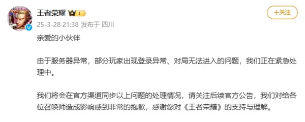 面对这一突发状况,王者荣耀官方微博紧急发布了声明。官方表示,服务器的异常导致了部分玩家无法正常登录游戏、进入对局的情况。为了尽快解决这一问题,官方正在进行紧急处理,并提醒玩家们密切关注官方渠道发布的最新进展。官方在声明中诚恳表示,由于这次服务器问题给玩家们带来的不便和困扰,他们深感抱歉,并感谢广大召唤师对游戏的支持与理解。