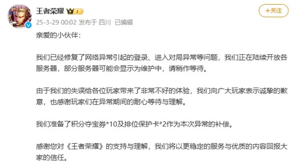 到了29日凌晨,王者荣耀官方再次发布了新的公告,告知玩家们问题已经得到修复。官方表示,他们已解决了由于网络异常引起的登录、进入对局异常等问题,并正在逐步恢复各个服务器的正常运行。虽然部分服务器仍处于维护状态,可能会显示“维护中”的提示,但官方承诺会尽快完成修复。为感谢玩家们在这段时间里的耐心等待,官方还为受影响的玩家准备了补偿,具体包括积分夺宝券10张和排位保护卡2张,作为对玩家们的歉意和补偿。