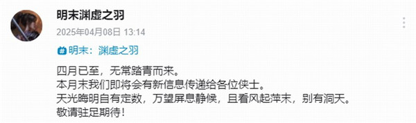 官方在公告中表示:“四月已至,无常踏青而来。本月末我们即将会有新信息传递给各位侠士。天光晦明自有定数,万望屏息静候,且看风起萍末,别有洞天。敬请驻足期待!”