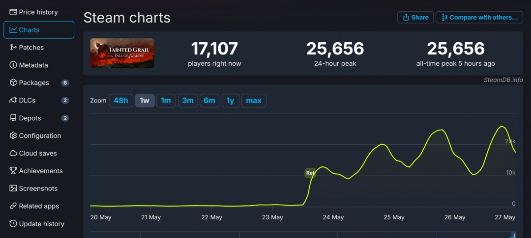 根据SteamDB的统计数据显示,污痕圣杯:阿瓦隆的陨落在Steam上的在线峰值突破了2.5万人,达到了25656人,而当前在线人数为17107人,显示出强劲的玩家活跃度。