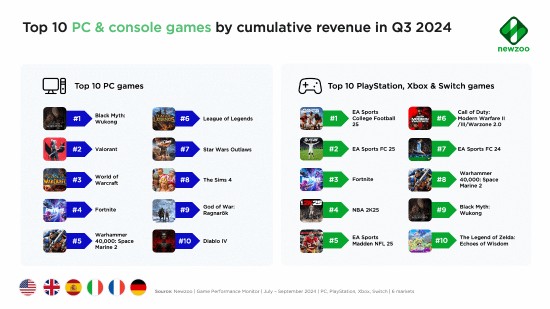 据外媒援引数据分析公司Newzoo消息,《黑神话:悟空》在24年Q3战绩不俗,位列欧美市场游戏收入榜第五位,更是拿下PC单榜收入冠军。(编者按:文中欧美市场为美英法德意西六国)