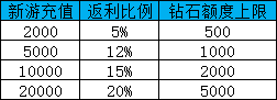 历史充值了10w,在新游7天内冲值2w,可获得历史累充20%的绑钻额度,可额外获得5000钻石