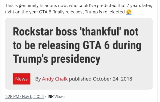 2018年,Rockstar联合创始人Dan Houser接受采访时表示,他很高兴工作室的下一款作品是《荒野大镖客2》,因为他不想在特朗普任期内推出《GTA6》。但令人哭笑不得的是,在《GTA6》即将发售之际,特朗普又要当选总统了。