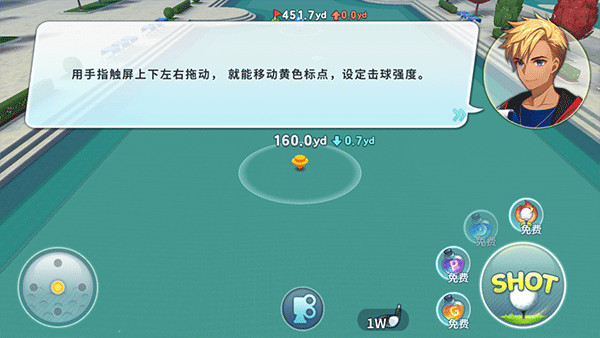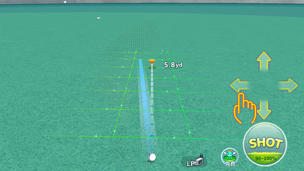 按住屏幕并拖动手指,黄色标记点会随之移动。通过自由控制标记点的移动,可以调节击球的力度,从而影响球的飞行距离。